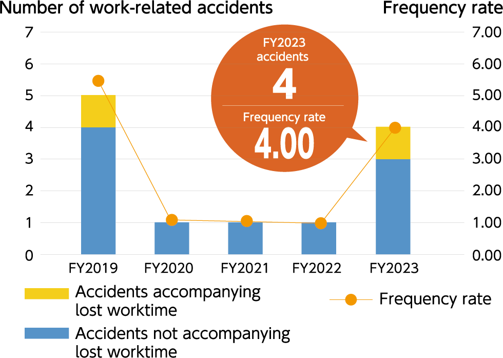 In fiscal 2023, there was one accident resulting in lost worktime and three accidents not resulting in lost worktime. Thus, we failed to achieve our goal of zero occupational accidents. In terms of the types of accidents, two involved coming into contact with a harmful substance, one involved a cut or abrasion, and one was a fall or collision accident. Taking the occurrence of these accidents seriously, we will strive to prevent future occupational accidents by reviewing the sources of danger that have been identified in past incidents and risk predictions and re-examining the relevance and effectiveness of our countermeasures.