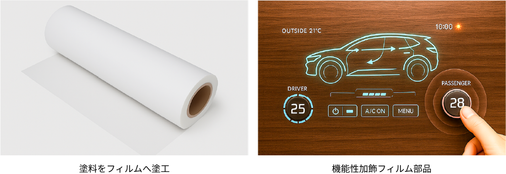コーティング事業は、あらゆる分野に対応した意匠性および機能性に優れたコーティング材を提供し、国内・海外において業界をリードするプラスチック用コーティング材の草分け的存在です。自動車市場においては、内外装部品用途として、世界で高いシェアと信頼を獲得しています。非自動車市場においても、化粧品容器・フィルム用途をはじめ、あらゆるニーズに幅広くお応えする製品を提供しております。
