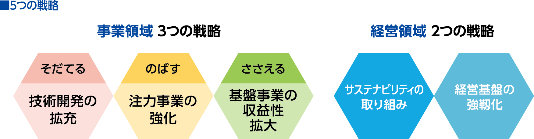 第11次中期経営計画では、基本方針として、「次世代に繋げる新しい姿の構築」を掲げました。今回の中期経営計画においては、本方針に基づき、事業領域3つの戦略と経営領域2つの戦略を策定し、当社の持続的成長のための5つの戦略として、全社で取り組みを進めていくこととしました。