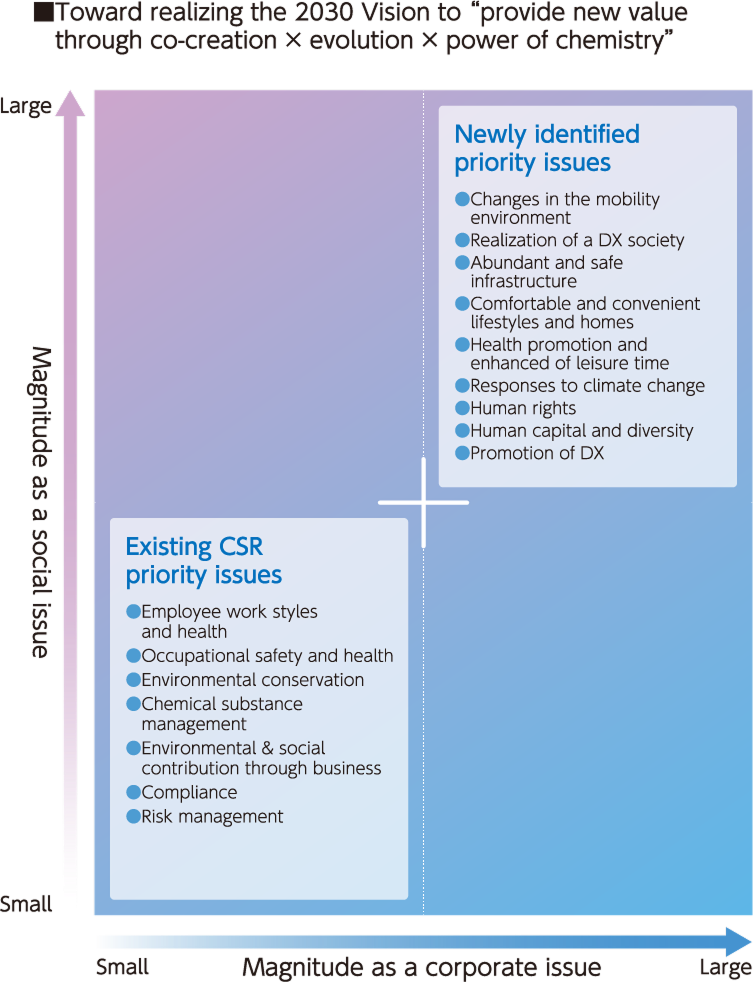 Building on our existing CSR priority issues, we have identified new issues to establish our Materiality, carefully evaluating the significance of both social issues and our own challenges. We will not only pursue defensive measures, but also proactive initiatives to help solve social issues and create new value.