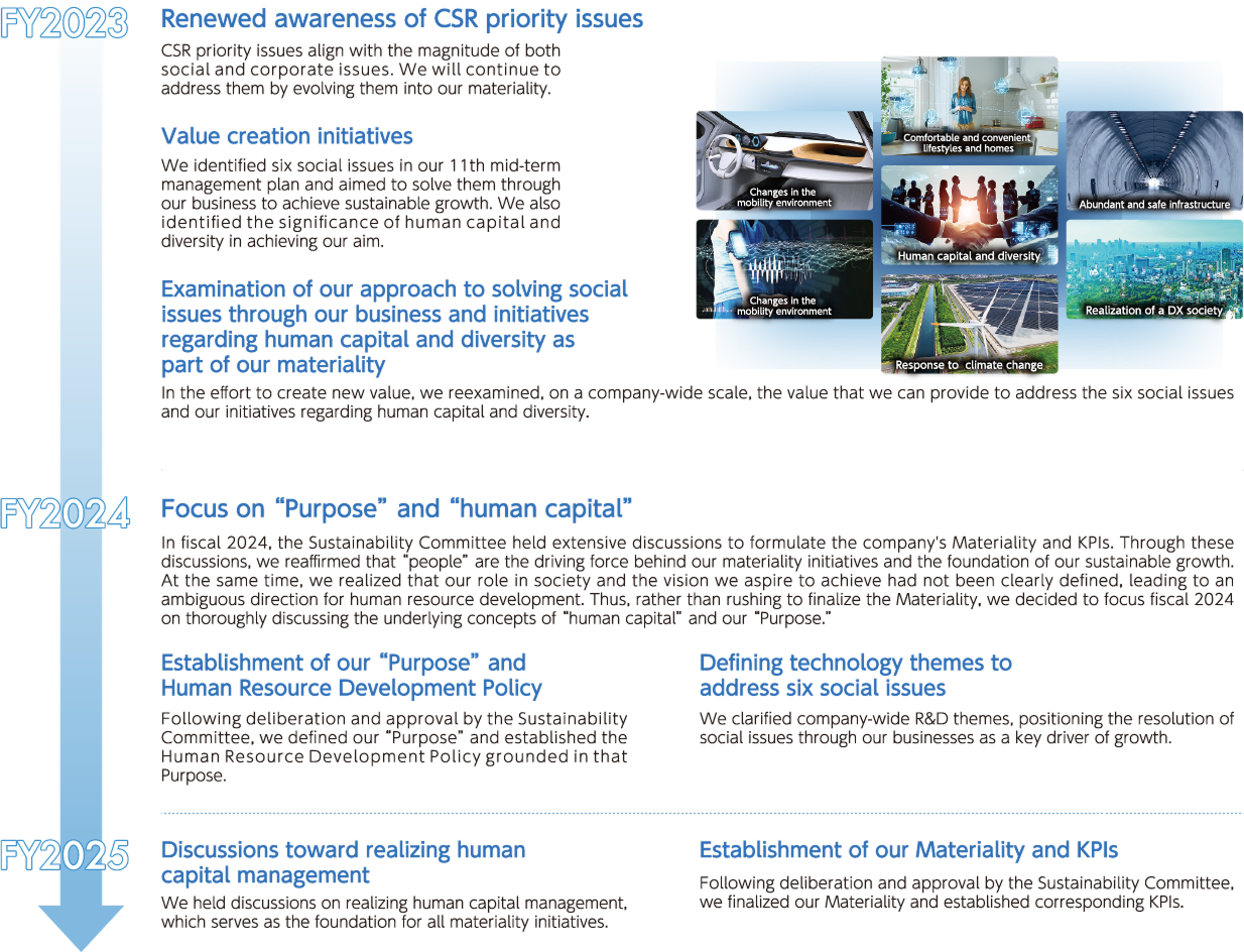 As one of our current CSR priority issues, we have focused company-wide efforts on reducing business risks and fulfilling our corporate responsibilities. As a result, CSR initiatives have become deeply embedded in our corporate culture. Recognizing that we have reached a stage where we should advance to the next level, we began formulating our Materiality in fiscal 2023—positioned above CSR—to further strengthen our sustainability management.