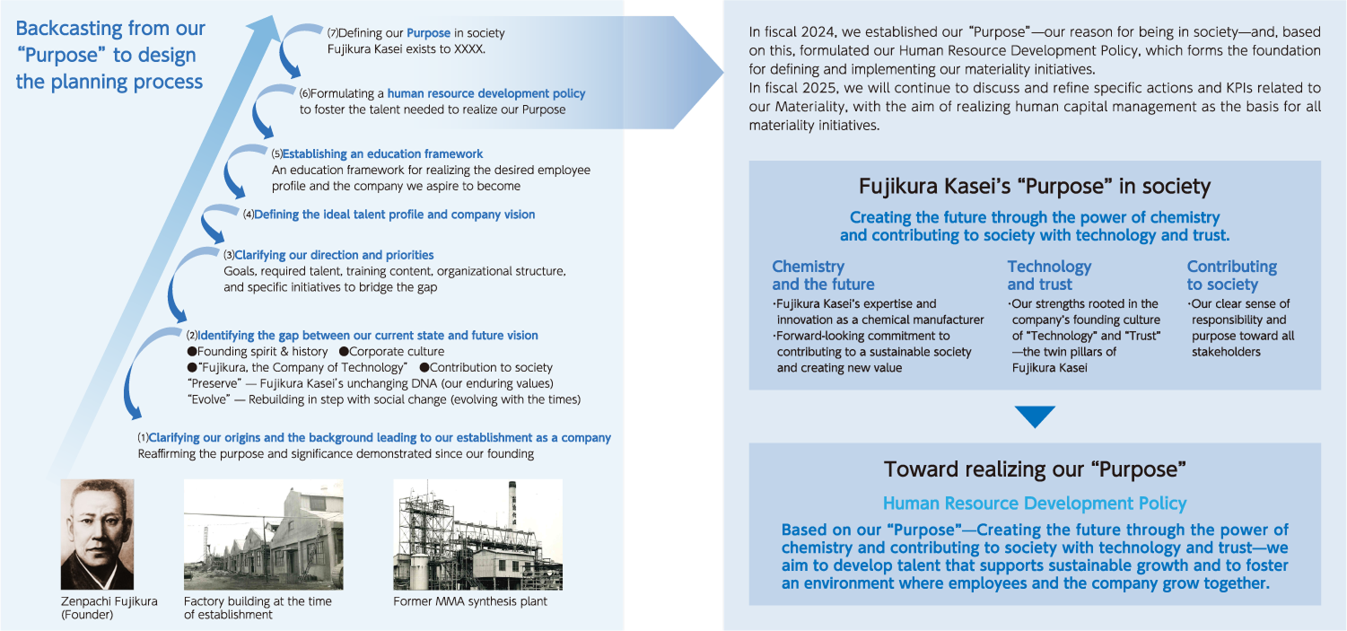 To realize human capital management, we adopted a backcasting approach that began with defining our corporate purpose and worked backward to design the necessary processes to realize it. Through this approach, we have steadily advanced our discussions and initiatives.